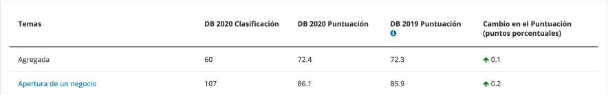 Esto quiere decir que nos hemos quedado cruzados de brazos sin hacer nada, NO. La clave está en que los demás países están realizando cambios más rápido de nosotros. Por ello vemos que a pesar de que México avanzó en puntuación en la escala agregada del estudio pasando de 72.3 en 2019 a 72.4 en 2020 pero en el ranking retrocedimos del 54 al 60. Es decir, mejoramos nuestro desempeño respecto al año anterior, no obstante, otros mejoraron mucho más. Otro ejemplo de esta situación sucede en el indicador de apertura de empresas, en donde, avanzamos 0.2 en la puntuación pasando de 85.9 a 86.1, pero retrocedimos en el ranking de 94 a 107.
